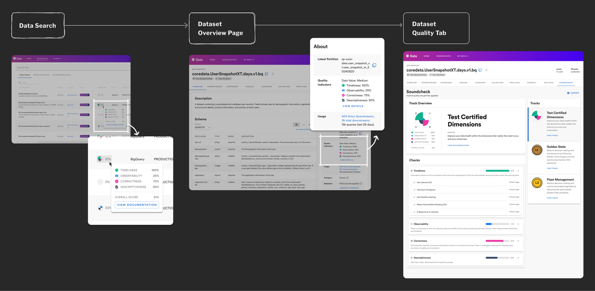Using insights and categories we generated together with users, we designed a new scoring system that revolves around “dimensions”. Each dimension represents an aspect of Data Quality: Timeliness, Observability, Correctness, and Descriptiveness, with their own disparate scores. In this new system, data producers can focus on quality aspects that matter for their use case (e.g. correctness for financial data), and data consumers understand the nuances of a particular dataset’s quality.