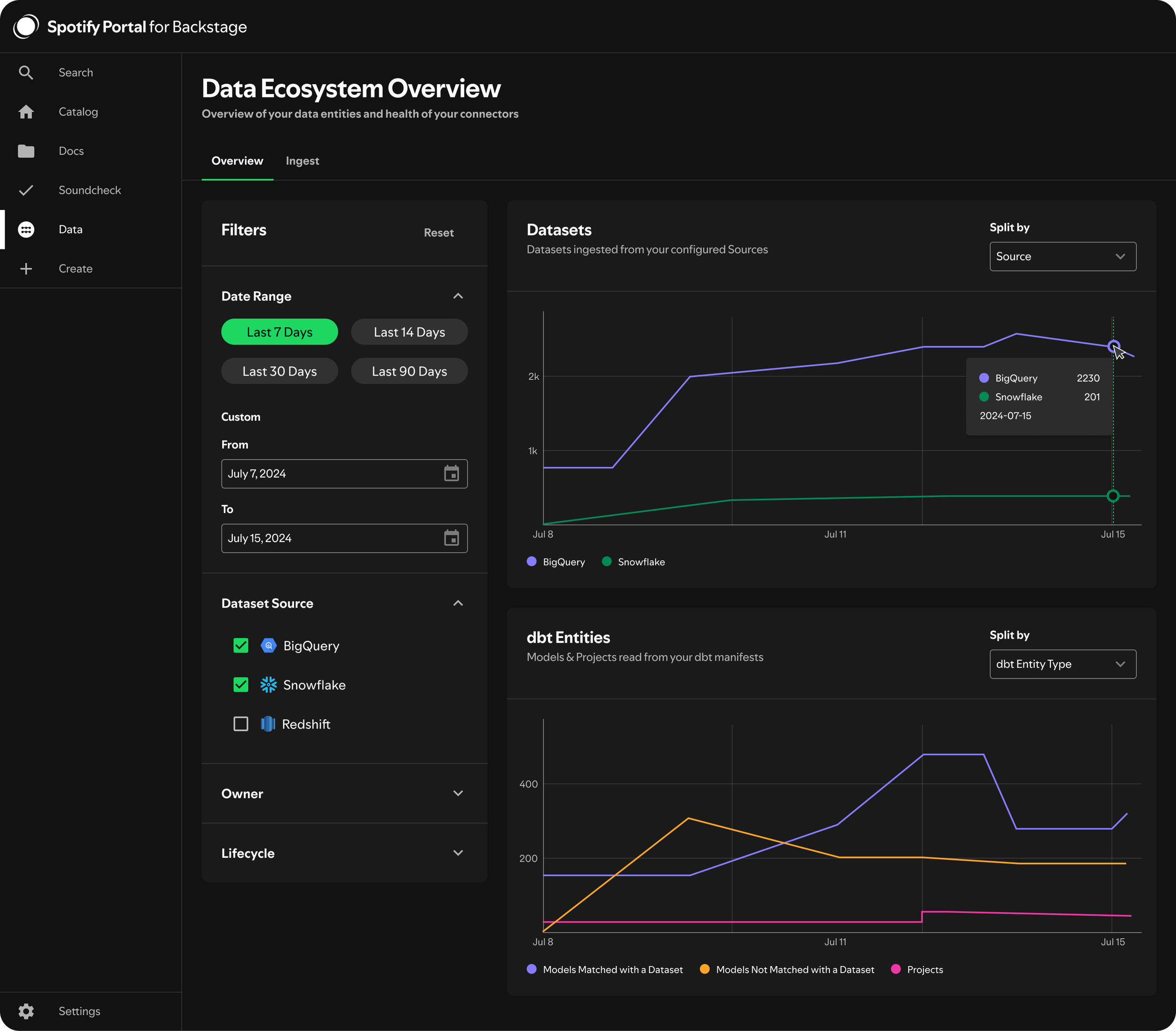In H2 2023, Spotify started a “Shipping Our Expertise” initiative, in which internal tools are evolved and packaged into commercial Developer Experience plugins. I led the design for Spotify’s first foray into commercializing its Data Management tools, establishing processes, strategy and vision, as well as shipping MVPs for alpha customers.